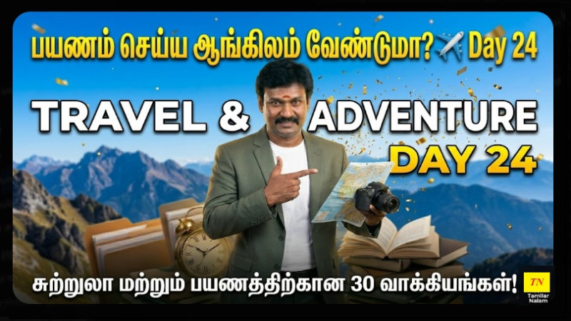 இதோ 24-வது நாளுக்கான (Day 24) சிறப்புப் பயிற்சிகள். இன்று நாம் 'Travel & Tourism' (பயணம் மற்றும் சுற்றுலா) சார்ந்த 30 வாக்கியங்களைக் கற்கப் போகிறோம். விடுமுறை நாட்களிலோ அல்லது அலுவல் ரீதியாகவோ வெளிநாடுகளுக்கோ அல்லது வெளிமாநிலங்களுக்கோ செல்லும்போது இவை மிகவும் உதவியாக இருக்கும்.