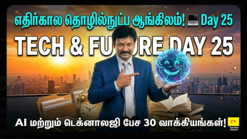 இதோ 25-வது நாளுக்கான (Day 25) சிறப்புப் பயிற்சிகள். இன்று நாம் 'Technology & The Future' (தொழில்நுட்பம் மற்றும் எதிர்காலம்) சார்ந்த 30 வாக்கியங்களைக் கற்கப் போகிறோம். 2026-ஆம் ஆண்டில் செயற்கை நுண்ணறிவு (AI) மற்றும் டிஜிட்டல் தொழில்நுட்பம் நம் வாழ்வின் அங்கமாகிவிட்ட சூழலில், இவை மிகவும் பயனுள்ளதாக இருக்கும்.